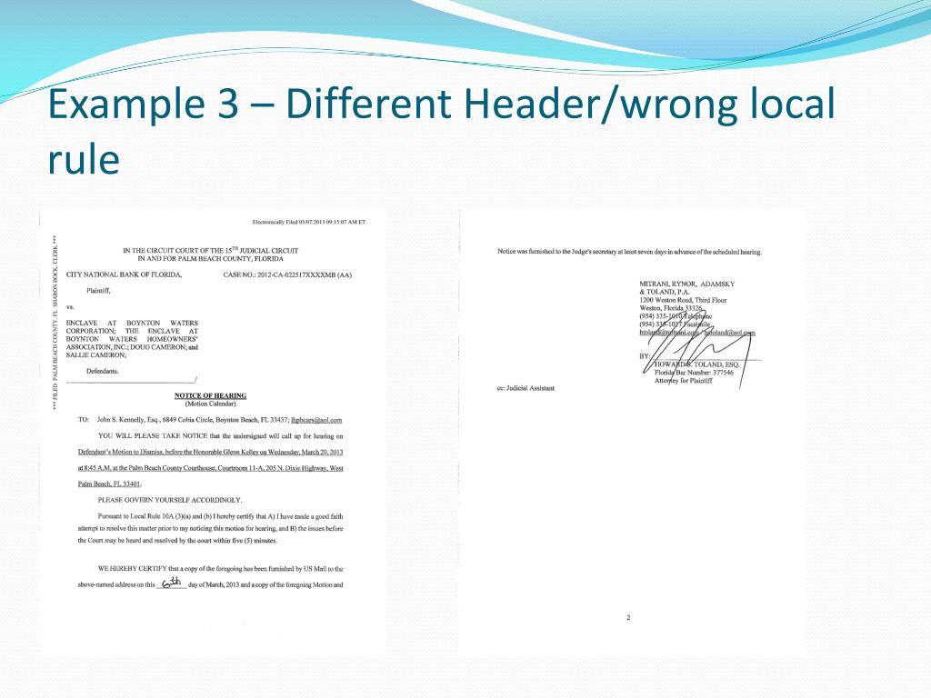 ADA Language • Florida Rule of Judicial Administration 2.540 • All summonses and notices of hearings shall include the approved ADA language in bold 14 point font (times new roman or courier font). • 7 days advance notice is required. • Administrative Order 2.207 • Must include Spanish and Creole translations. • Language found at www.15thcircuit.com
