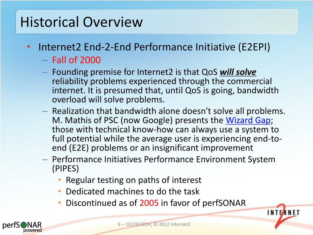 Historical Overview • Internet2 End-2-End Performance Initiative (E2EPI) • Fall of 2000 • Founding premise for Internet2 is that QoS will solve reliability problems experienced through the commercial internet. It is presumed that, until QoS is going, bandwidth overload will solve problems. • Realization that bandwidth alone doesn't solve all problems. M. Mathis of PSC (now Google) presents the Wizard Gap; those with technical know-how can always use a system to full potential while the average user is experiencing end-to-end (E2E) problems or an insignificant improvement • Performance Initiatives Performance Environment System (PIPES) • Regular testing on paths of interest • Dedicated machines to do the task • Discontinued as of 2005 in favor of perfSONAR