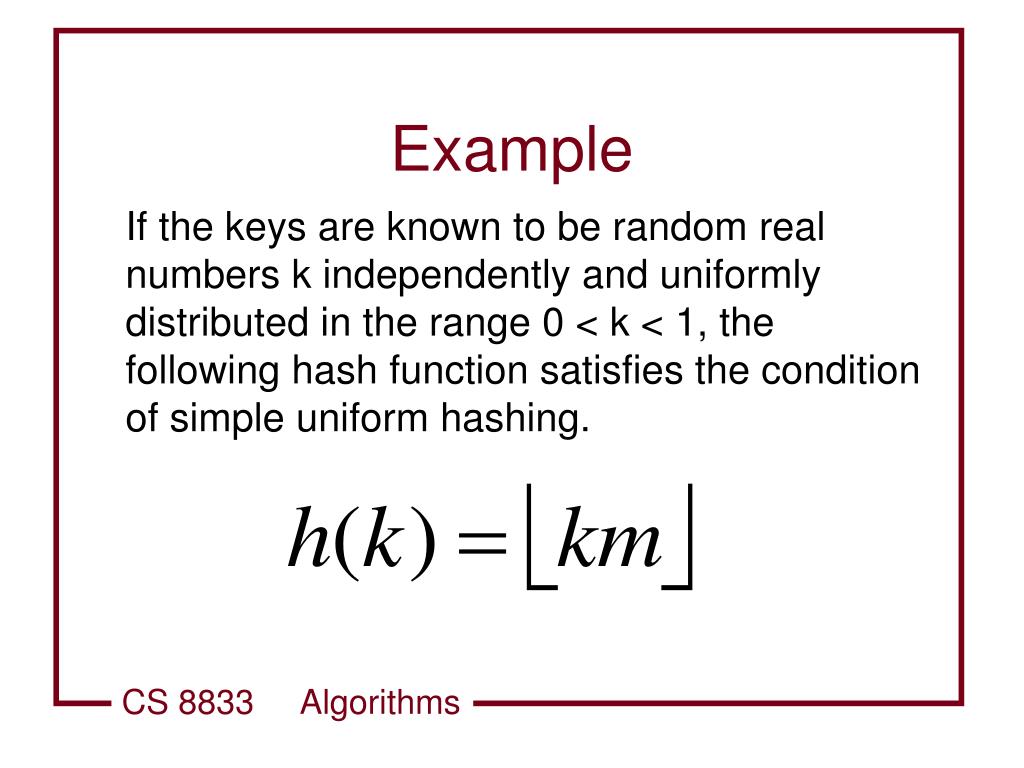 Example If the keys are known to be random real numbers k independently and uniformly distributed in the range 0 < k < 1, the following hash function satisfies the condition of simple uniform hashing.