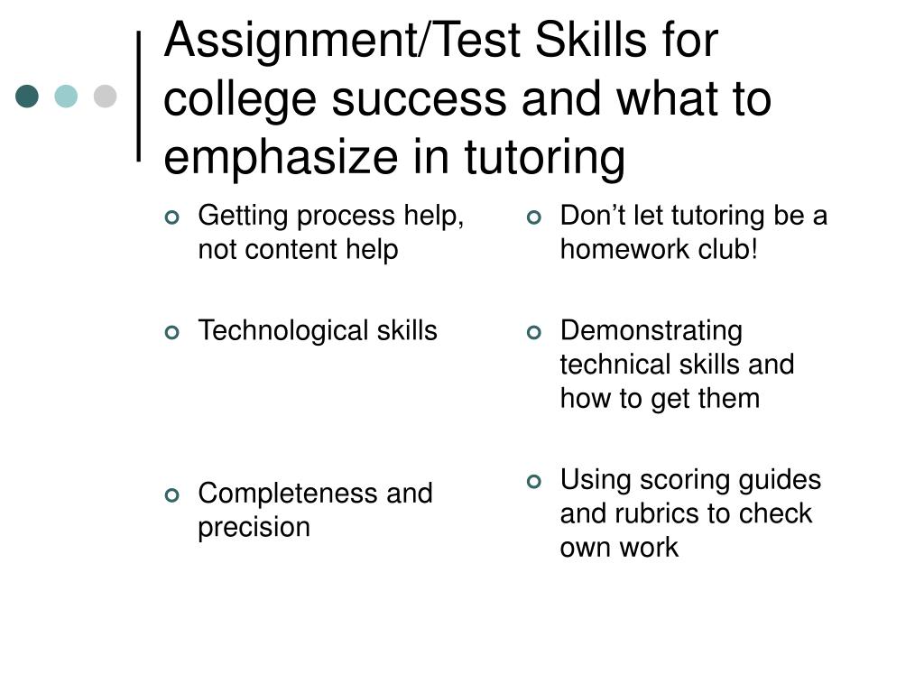 Getting process help, not content help Technological skills Completeness and precision Don’t let tutoring be a homework club! Demonstrating technical skills and how to get them Using scoring guides and rubrics to check own work Assignment/Test Skills for college success and what to emphasize in tutoring