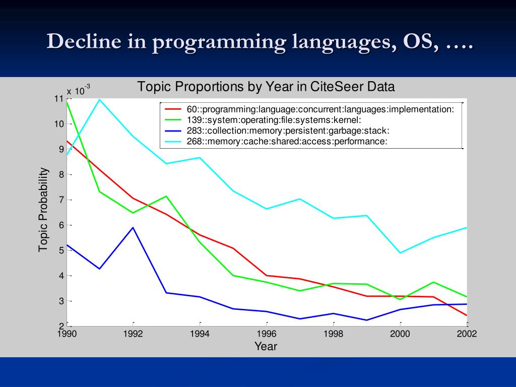 Temporal patterns in topics: hot and cold topics • We have CiteSeer papers from 1986-2001 • We can calculate time-series for topics • Hot topics become more prevalent • Cold topics become less prevalent • Do time-series correspond with known trends in computer science?