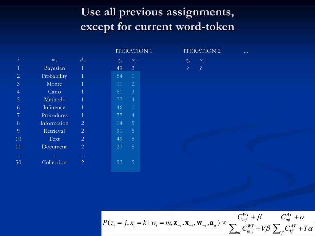 Gibbs sampling in Author-Topics • Need full conditional distributions for variables • The probability of assigning the current word i to topic j and author k given everything else: number of times word w assigned to topic j number of times topic j assigned to author k