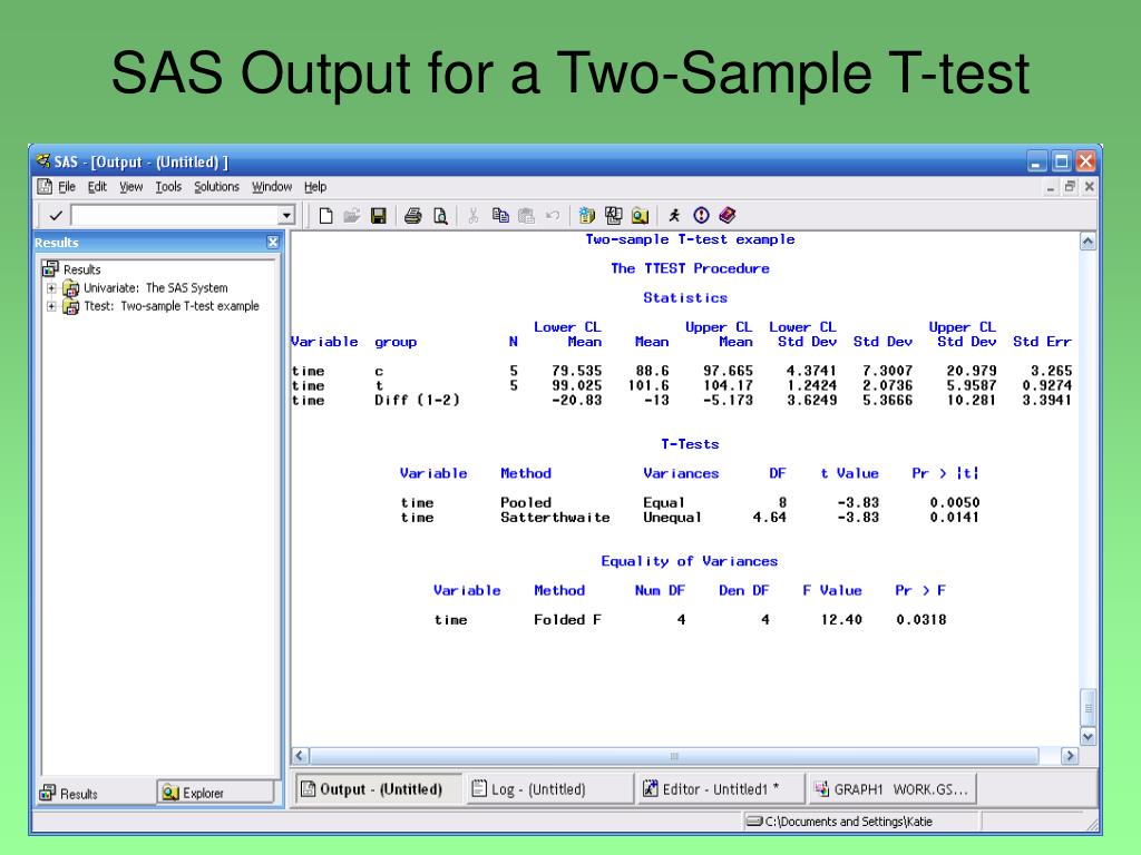 Two-Sample T-test in SAS We want to determine whether a new headache medicine provides a different time to relief than a control medicine. Two groups of five subjects each are either given the treatment or control. Ho: µ1 = µ2 Ha: µ1≠ µ2 Before we can conduct the two-sample t-test, however, we must determine whether the data come from a normal distribution.