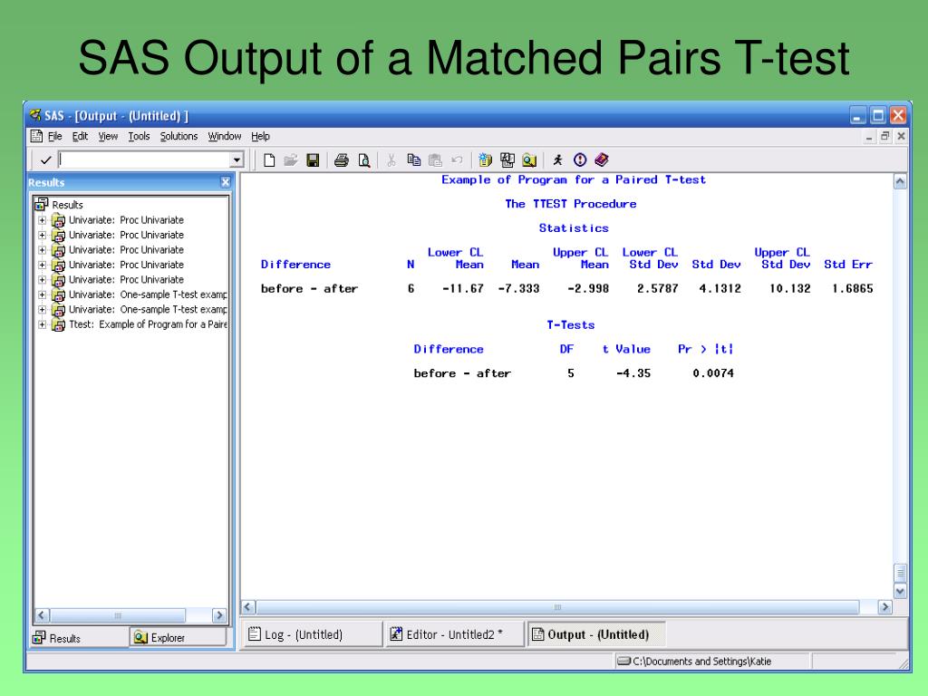 SAS Code for Matched Pairs T-test PROCTTESTDATA = study; TITLE“Example of Program for a Paired T-test” ; PAIRED before * after; RUN; The code tells SAS to do a paired t-test on the data set study, and it will compare the difference of the means between before and after.