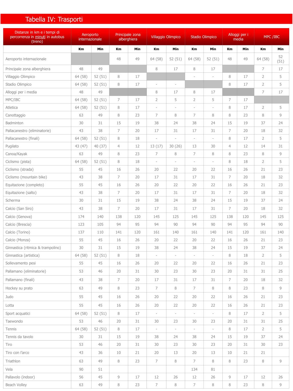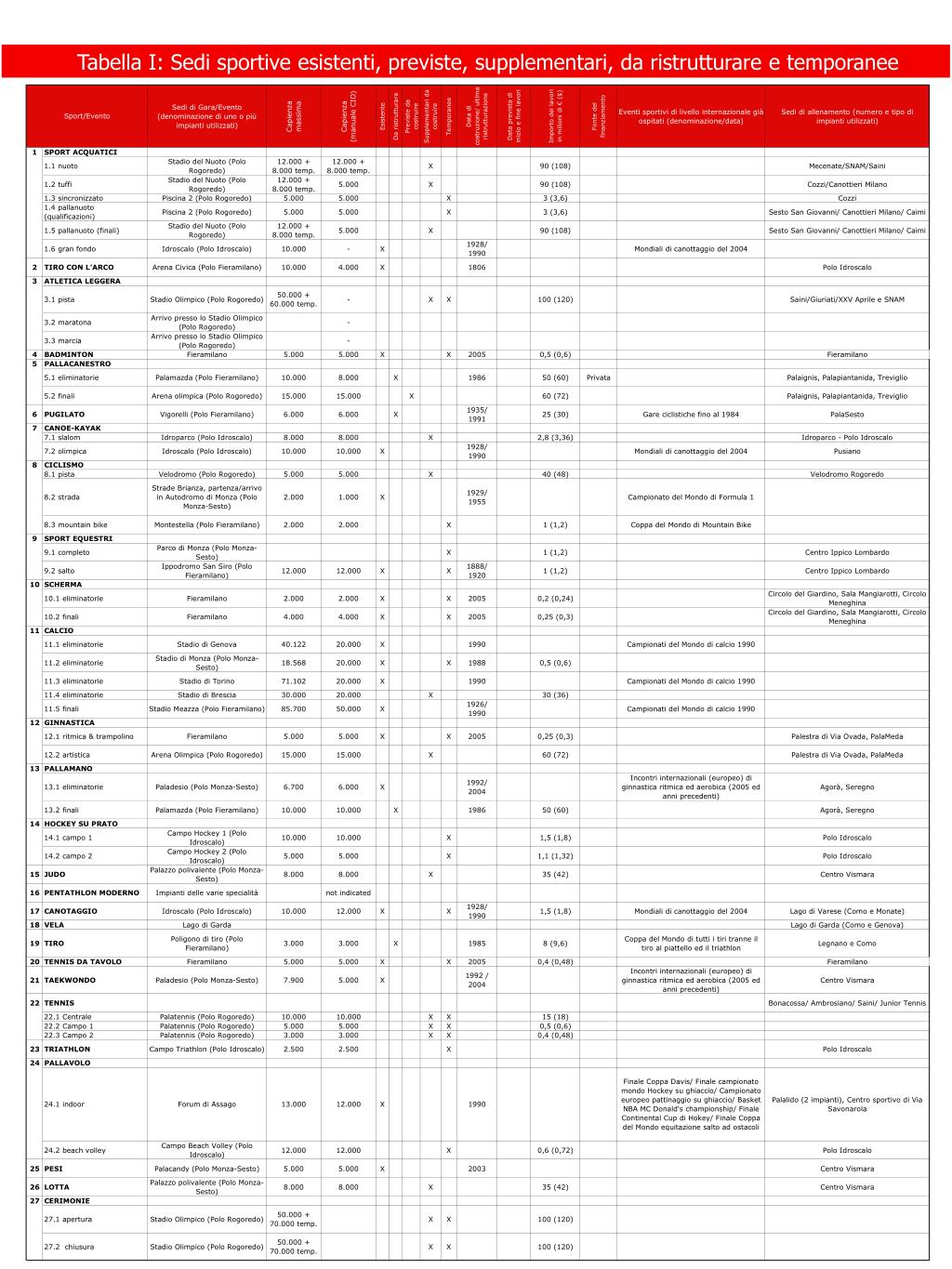 Tabella I: Sedi sportive esistenti, previste, supplementari, da ristrutturare e temporanee