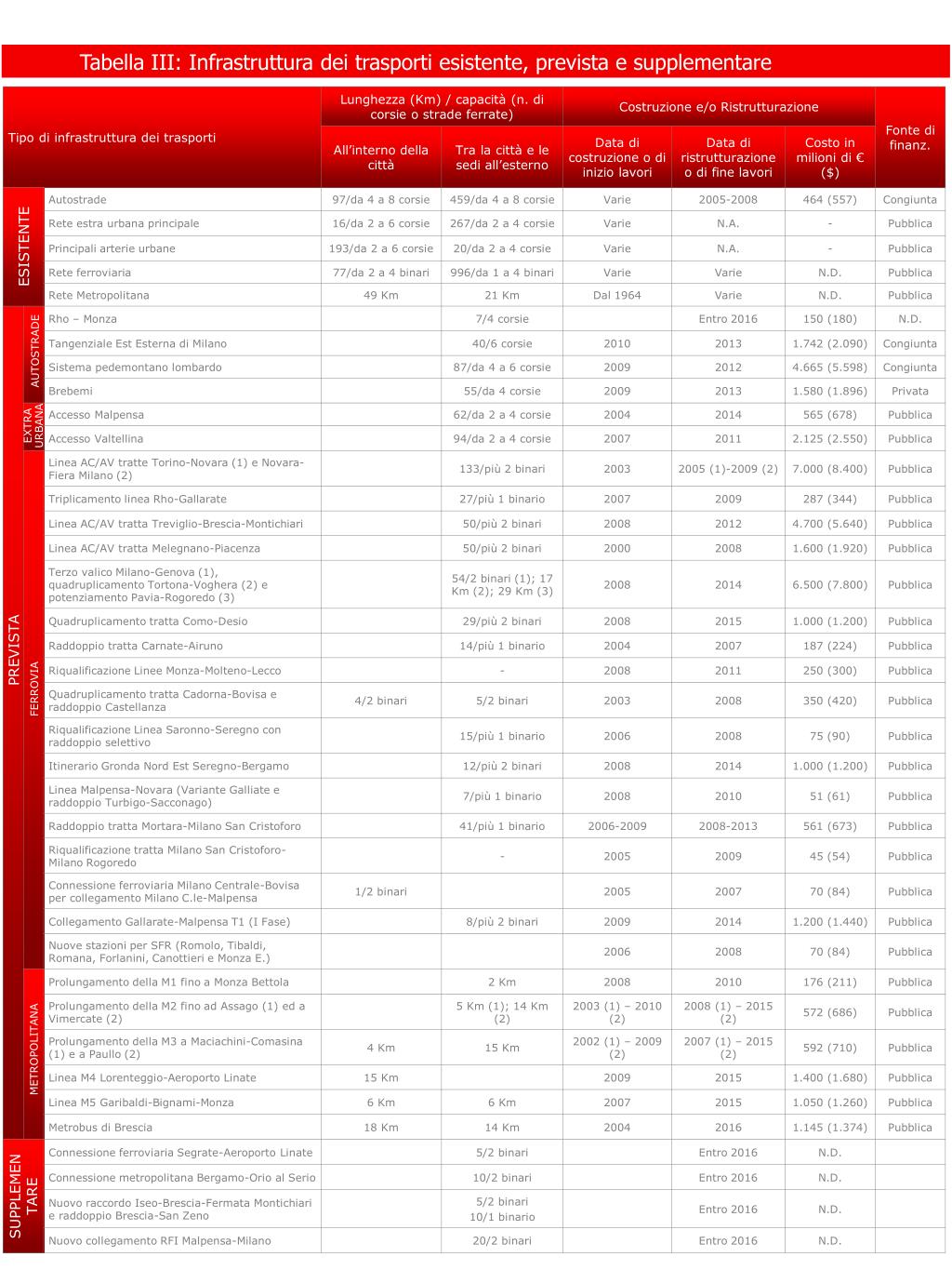 Tabella III: Infrastruttura dei trasporti esistente, prevista e supplementare ESISTENTE AUTOSTRADE EXTRA URBANA PREVISTA FERROVIA METROPOLITANA SUPPLEMEN TARE