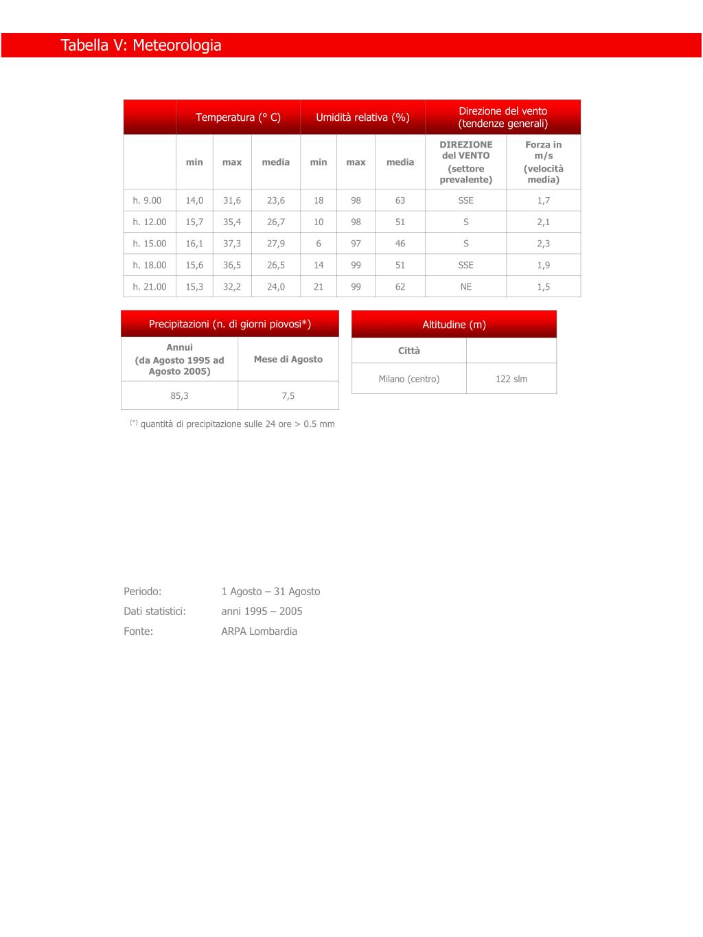 Tabella V: Meteorologia (*) quantità di precipitazione sulle 24 ore > 0.5 mm Periodo: 1 Agosto – 31 Agosto Dati statistici: anni 1995 – 2005 Fonte: ARPA Lombardia