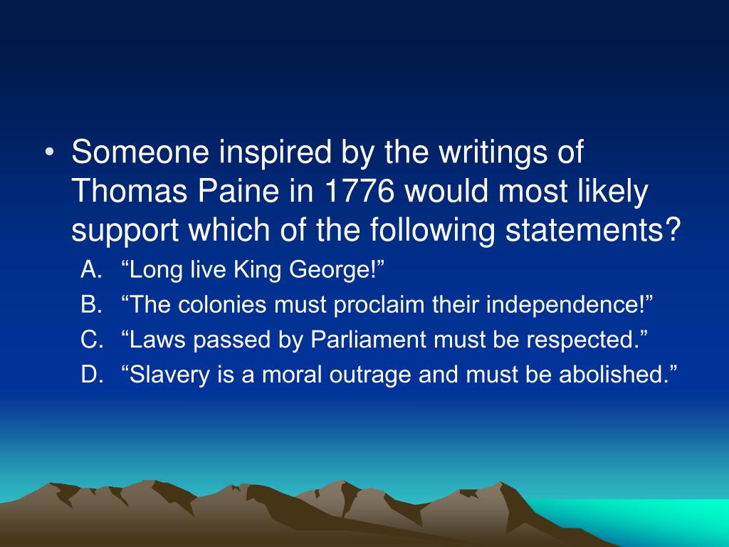 Someone inspired by the writings of Thomas Paine in 1776 would most likely support which of the following statements? • “Long live King George!” • “The colonies must proclaim their independence!” • “Laws passed by Parliament must be respected.” • “Slavery is a moral outrage and must be abolished.”