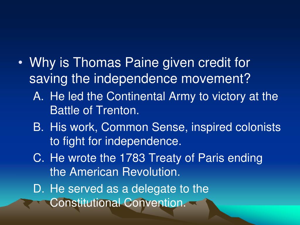Why is Thomas Paine given credit for saving the independence movement? • He led the Continental Army to victory at the Battle of Trenton. • His work, Common Sense, inspired colonists to fight for independence. • He wrote the 1783 Treaty of Paris ending the American Revolution. • He served as a delegate to the Constitutional Convention.