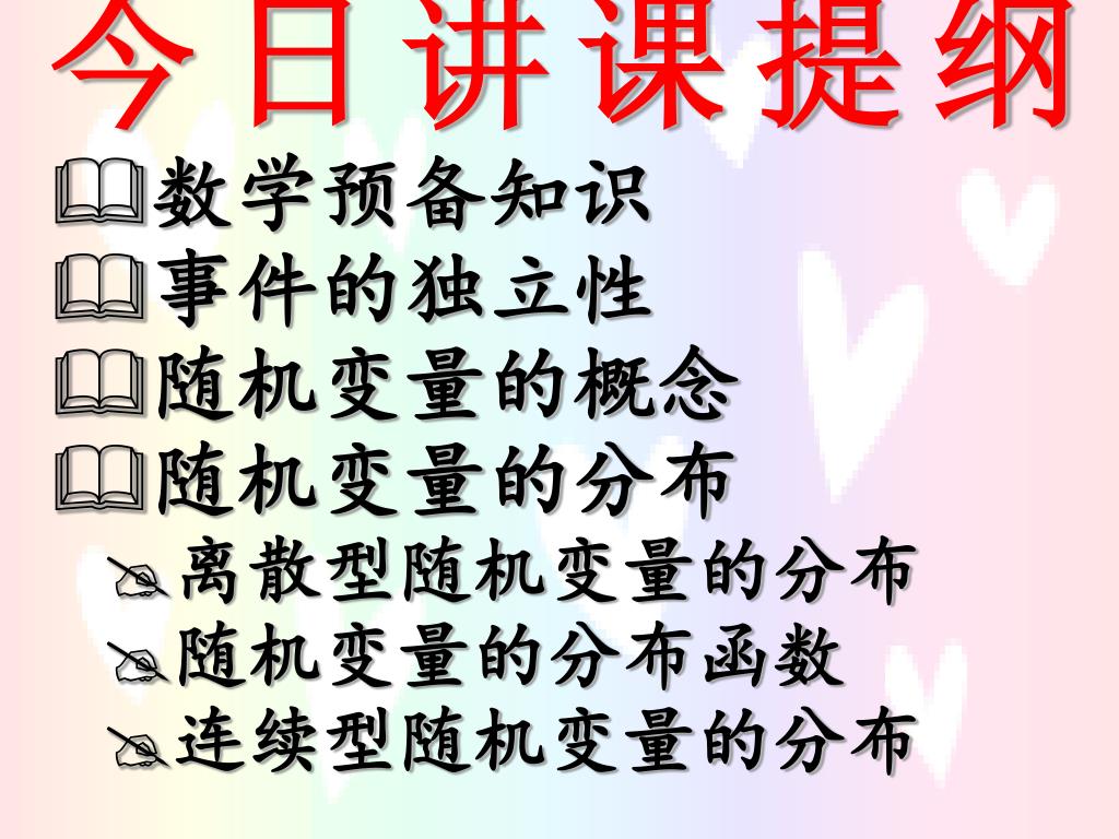 今日讲课提纲 • 数学预备知识 • 事件的独立性 • 随机变量的概念 • 随机变量的分布 • 离散型随机变量的分布 • 随机变量的分布函数 • 连续型随机变量的分布