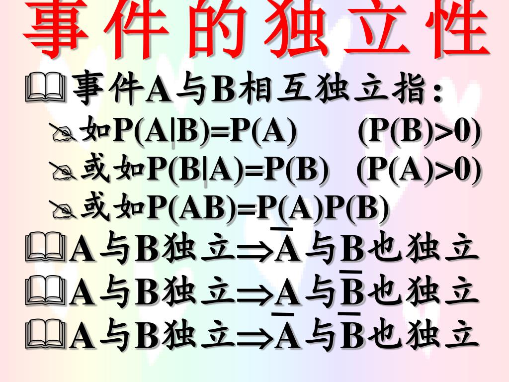 事件的独立性 • 事件A与B相互独立指: • 如P(A|B)=P(A) (P(B)>0) • 或如P(B|A)=P(B) (P(A)>0) • 或如P(AB)=P(A)P(B) • A与B独立A与B也独立 • A与B独立A与B也独立 • A与B独立A与B也独立