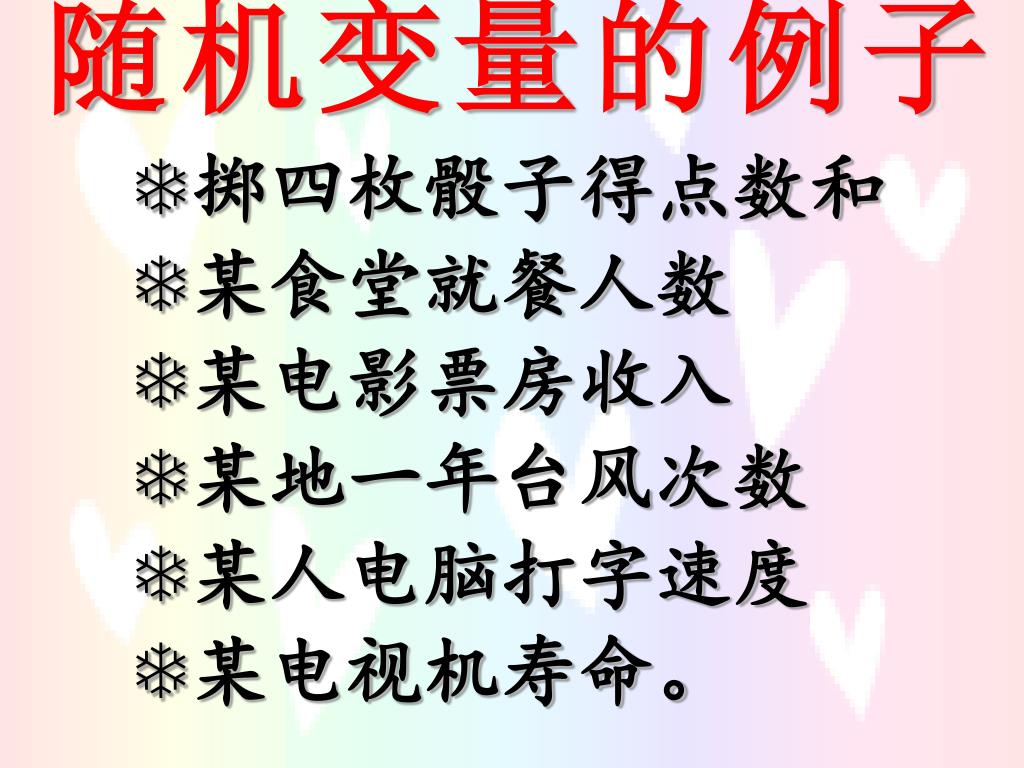 随机变量的例子 • 掷四枚骰子得点数和 • 某食堂就餐人数 • 某电影票房收入 • 某地一年台风次数 • 某人电脑打字速度 • 某电视机寿命。