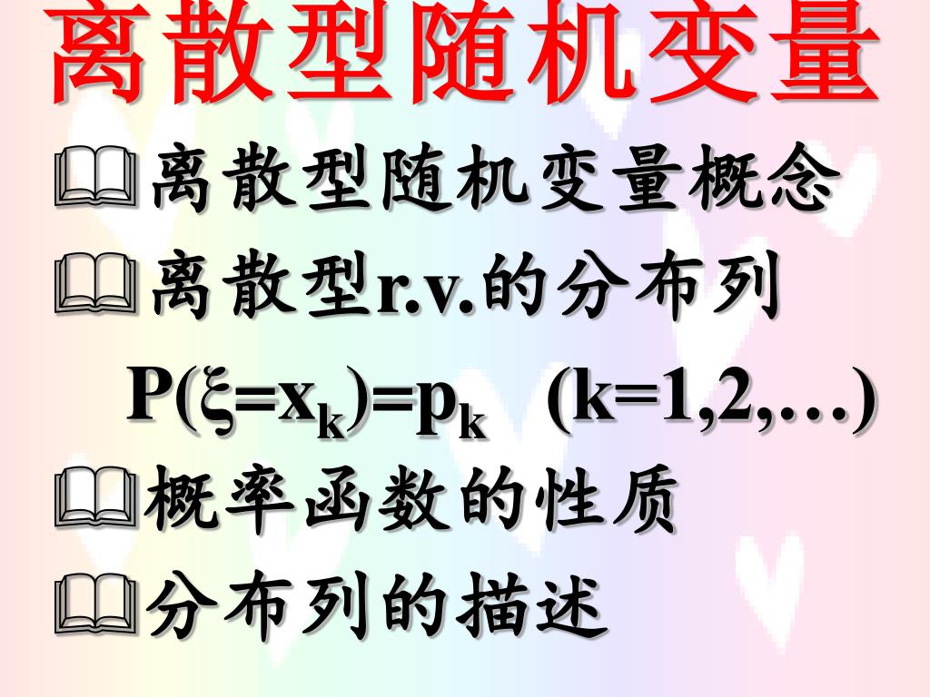 离散型随机变量 • 离散型随机变量概念 • 离散型r.v.的分布列 P(ξ=xk)=pk (k=1,2,…) • 概率函数的性质 • 分布列的描述