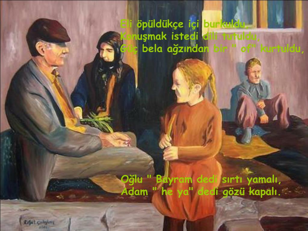 Eli öpüldükçe içi burkuldu, Konuşmak istedi dili tutuldu, Güç bela ağzından bir " of" kurtuldu, Oğlu " Bayram dedi sırtı yamalı, Adam " he ya" dedi gözü kapalı.