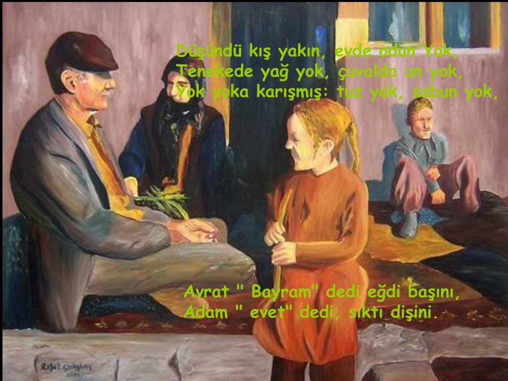 Düşündü kış yakın, evde odun Yok, Tenekede yağ yok, çuvalda un yok, Yok yoka karışmış: tuz yok, sabun yok, Avrat " Bayram" dedi eğdi başını, Adam " evet" dedi, sıktı dişini.