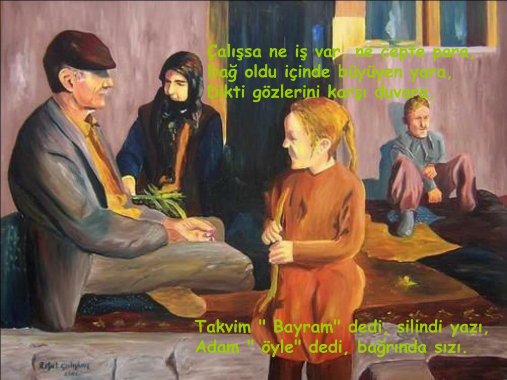 Çalışsa ne iş var, ne cepte para, Dağ oldu içinde büyüyen yara, Dikti gözlerini karşı duvara, Takvim " Bayram" dedi, silindi yazı, Adam " öyle" dedi, bağrında sızı.
