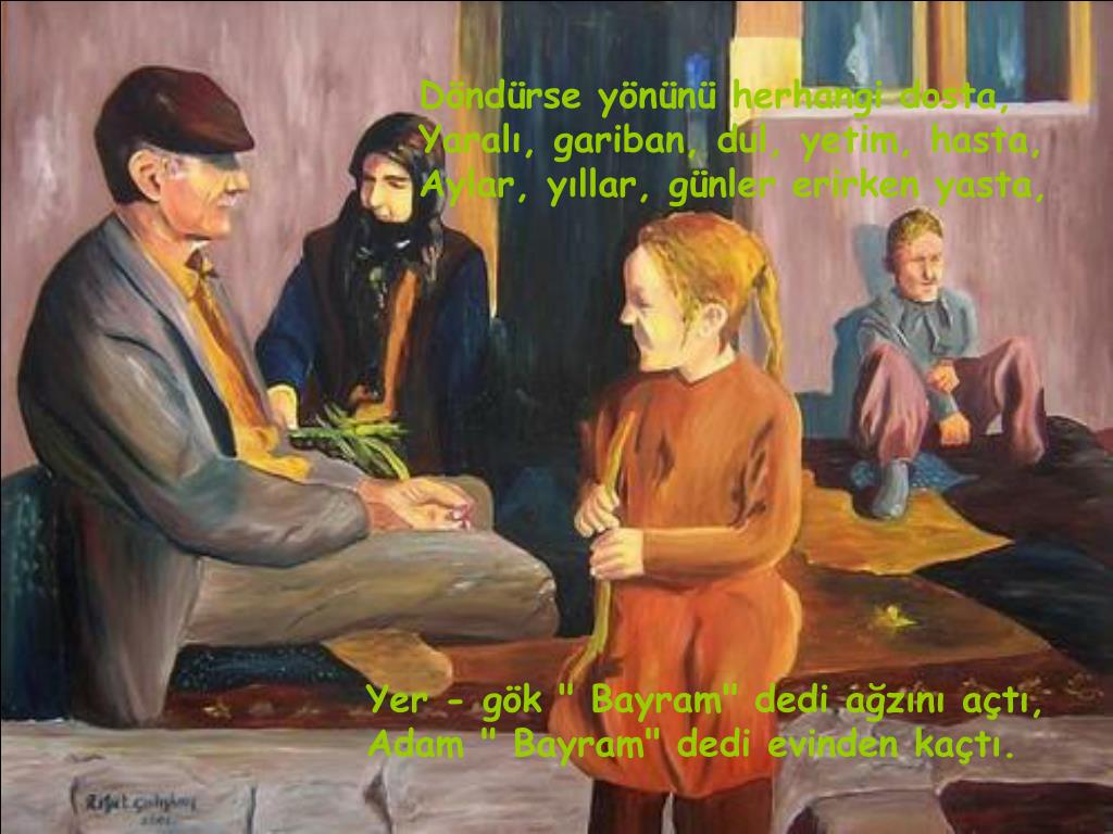 Döndürse yönünü herhangi dosta, Yaralı, gariban, dul, yetim, hasta, Aylar, yıllar, günler erirken yasta, Yer - gök " Bayram" dedi ağzını açtı, Adam " Bayram" dedi evinden kaçtı.