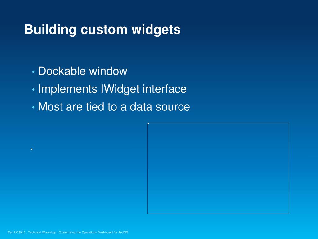 Building custom widgets • Dockable window • Implements IWidget interface • Most are tied to a data source Customizing the Operations Dashboard for ArcGIS