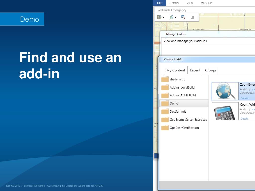 Demo Find and use an add-in Customizing the Operations Dashboard for ArcGIS