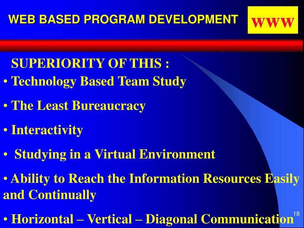 www WEB BASED PROGRAM DEVELOPMENT SUPERIORITY OF THIS : • Technology Based Team Study • The Least Bureaucracy • Interactivity • Studying in a Virtual Environment • Ability to Reach the Information Resources Easily and Continually • Horizontal – Vertical – Diagonal Communication