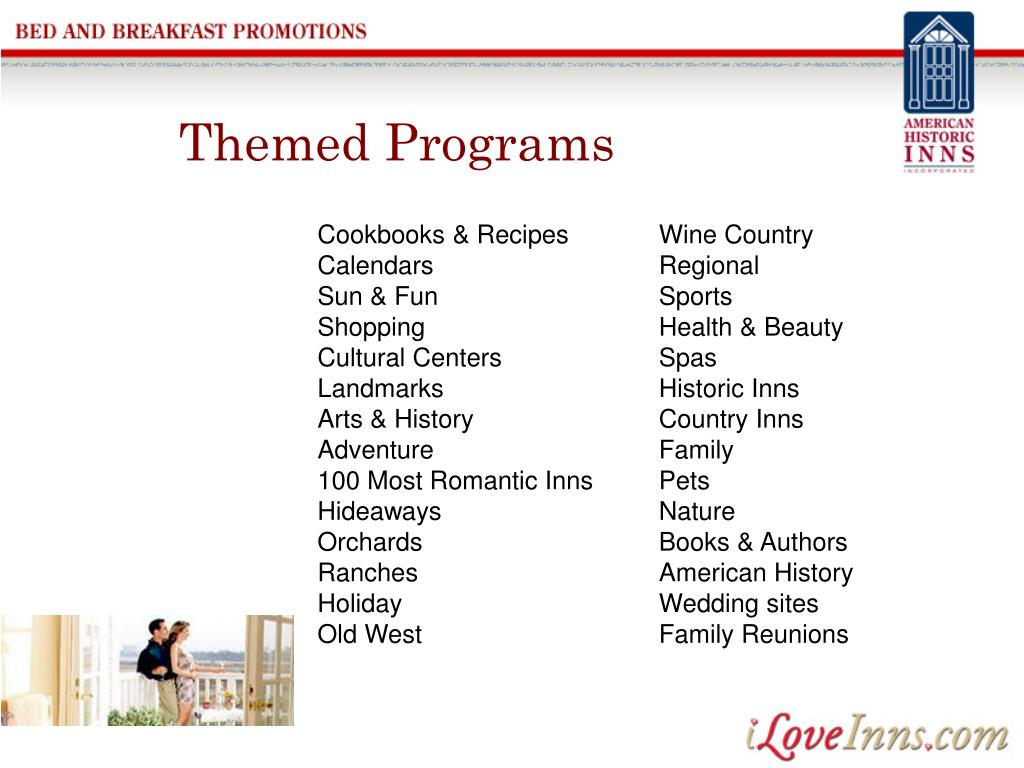 American Historic Inns. Bed & Breakfast Promotion and Sampling Opportunities. Our Story. Provide easy access and great motivation for travelers to explore B&Bs Industry leader for market research Represents the best of 19,000 B & B’s in North America