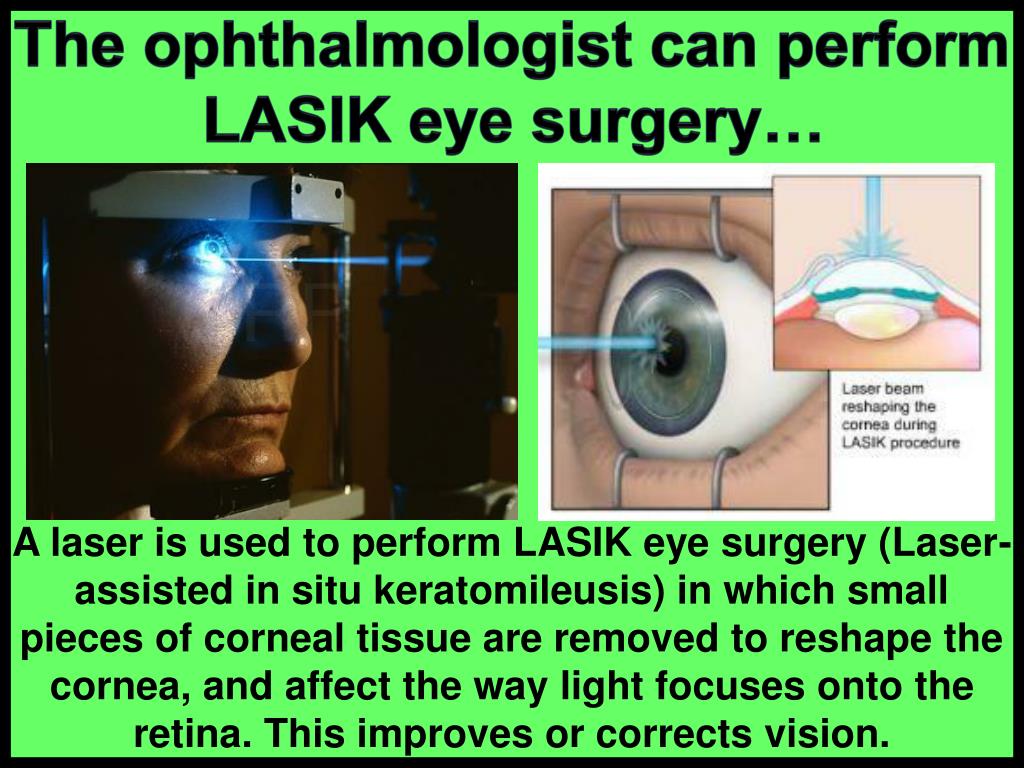 The ophthalmologist can perform LASIK eye surgery… A laser is used to perform LASIK eye surgery (Laser-assisted in situ keratomileusis) in which small pieces of corneal tissue are removed to reshape the cornea, and affect the way light focuses onto the retina. This improves or corrects vision.