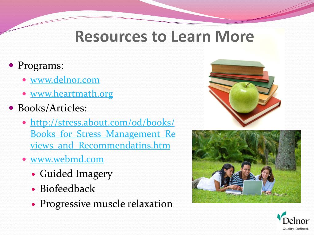 Resources to Learn More • Programs: • www.delnor.com • www.heartmath.org • Books/Articles: • http://stress.about.com/od/books/Books_for_Stress_Management_Reviews_and_Recommendatins.htm • www.webmd.com • Guided Imagery • Biofeedback • Progressive muscle relaxation