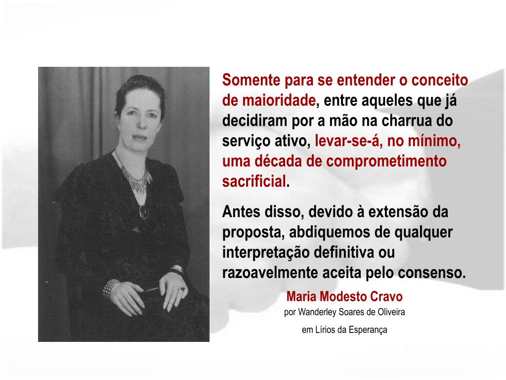Somente para se entender o conceito de maioridade, entre aqueles que já decidiram por a mão na charrua do serviço ativo, levar-se-á, no mínimo, uma década de comprometimento sacrificial. Antes disso, devido à extensão da proposta, abdiquemos de qualquer interpretação definitiva ou razoavelmente aceita pelo consenso. Maria Modesto Cravopor Wanderley Soares de Oliveira em Lírios da Esperança Maria Modesto Cravo