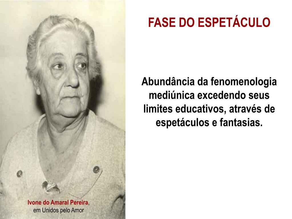 FASE DO ESPETÁCULO Abundância da fenomenologia mediúnica excedendo seus limites educativos, através de espetáculos e fantasias. Ivone do Amaral Pereira, em Unidos pelo Amor