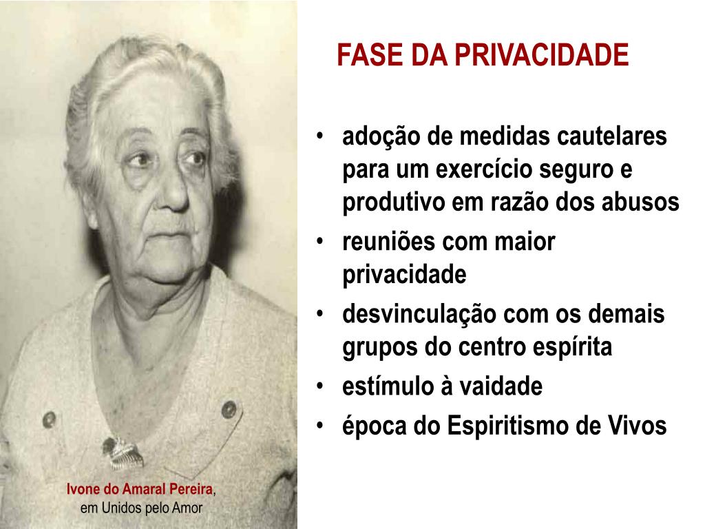 FASE DA PRIVACIDADE • adoção de medidas cautelares para um exercício seguro e produtivo em razão dos abusos • reuniões com maior privacidade • desvinculação com os demais grupos do centro espírita • estímulo à vaidade • época do Espiritismo de Vivos Ivone do Amaral Pereira, em Unidos pelo Amor