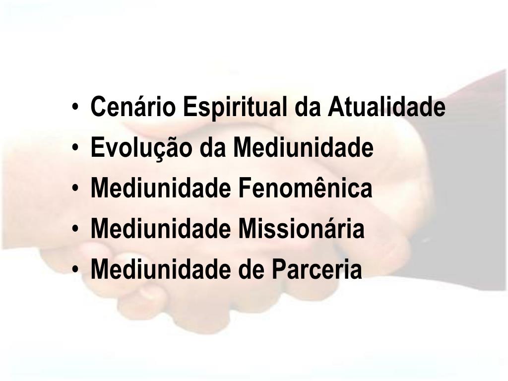 Cenário Espiritual da Atualidade • Evolução da Mediunidade • Mediunidade Fenomênica • Mediunidade Missionária • Mediunidade de Parceria