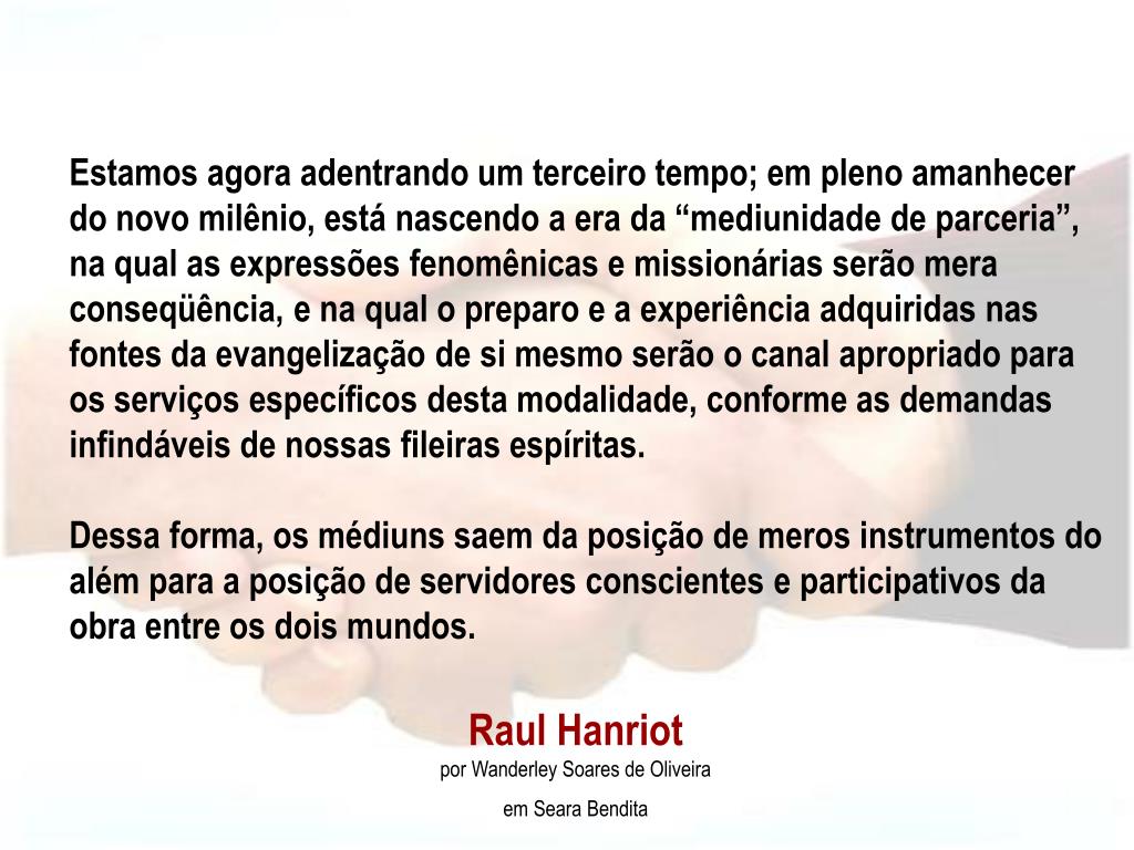 Estamos agora adentrando um terceiro tempo; em pleno amanhecer do novo milênio, está nascendo a era da “mediunidade de parceria”, na qual as expressões fenomênicas e missionárias serão mera conseqüência, e na qual o preparo e a experiência adquiridas nas fontes da evangelização de si mesmo serão o canal apropriado para os serviços específicos desta modalidade, conforme as demandas infindáveis de nossas fileiras espíritas.Dessa forma, os médiuns saem da posição de meros instrumentos do além para a posição de servidores conscientes e participativos da obra entre os dois mundos. Raul Hanriot por Wanderley Soares de Oliveira em Seara Bendita