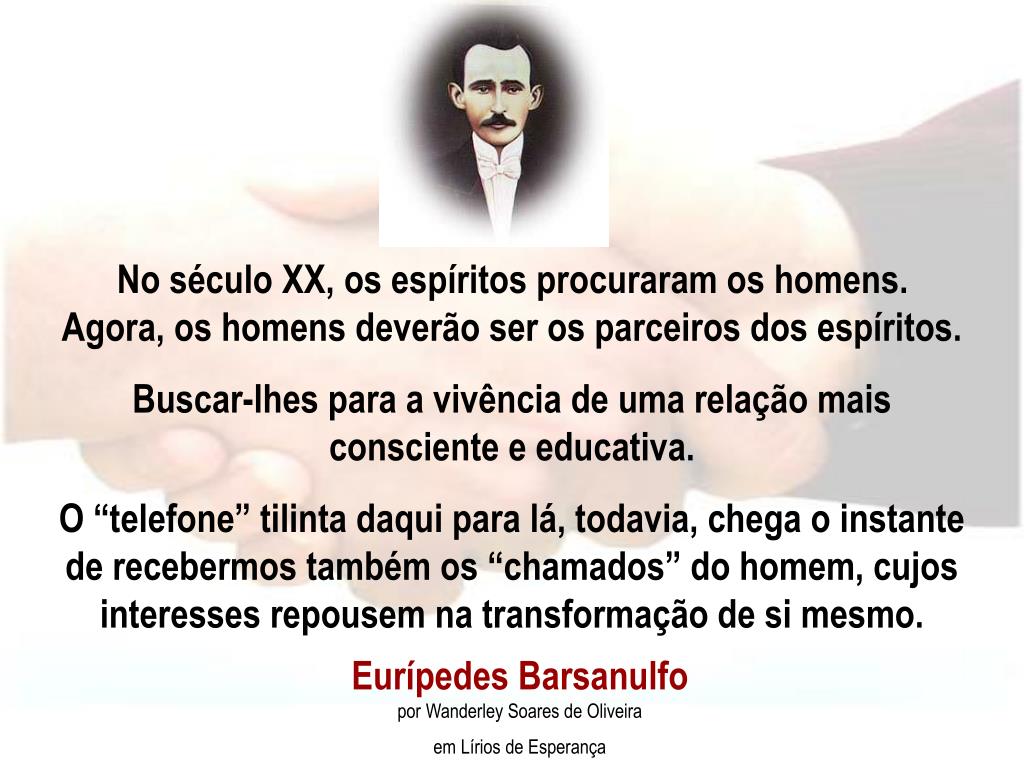 No século XX, os espíritos procuraram os homens. Agora, os homens deverão ser os parceiros dos espíritos. Buscar-lhes para a vivência de uma relação mais consciente e educativa. O “telefone” tilinta daqui para lá, todavia, chega o instante de recebermos também os “chamados” do homem, cujos interesses repousem na transformação de si mesmo. Eurípedes Barsanulfo por Wanderley Soares de Oliveira em Lírios de Esperança