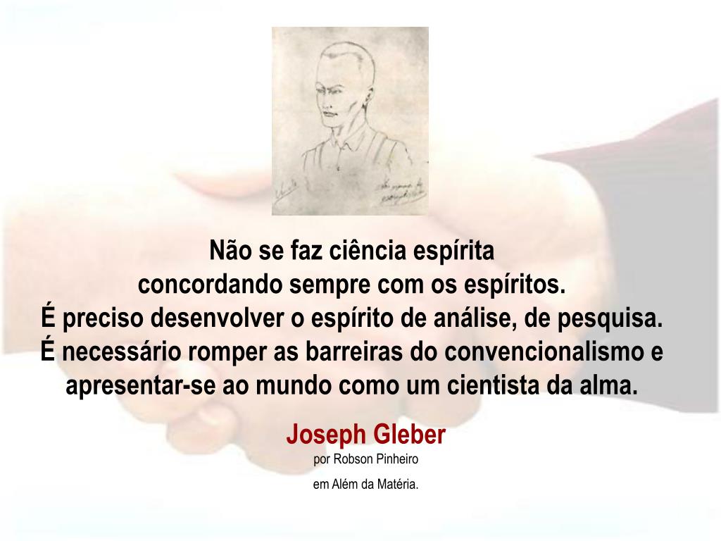 Não se faz ciência espírita concordando sempre com os espíritos.É preciso desenvolver o espírito de análise, de pesquisa. É necessário romper as barreiras do convencionalismo e apresentar-se ao mundo como um cientista da alma. Joseph Gleber por Robson Pinheiro em Além da Matéria.