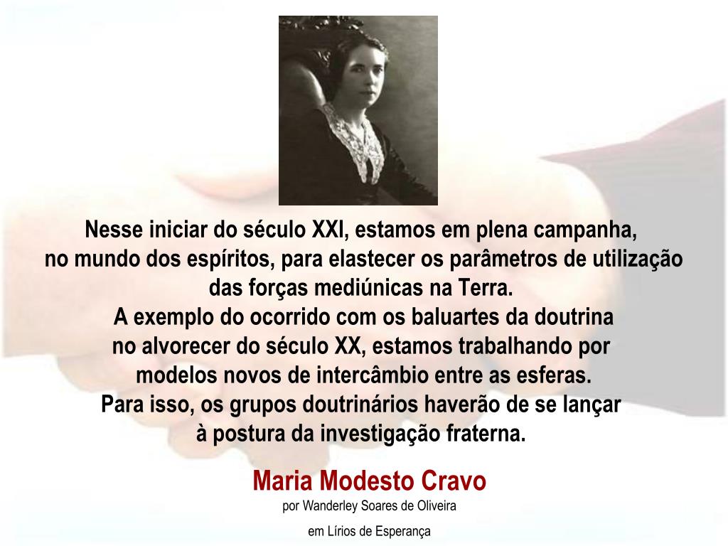 Nesse iniciar do século XXI, estamos em plena campanha, no mundo dos espíritos, para elastecer os parâmetros de utilização das forças mediúnicas na Terra. A exemplo do ocorrido com os baluartes da doutrina no alvorecer do século XX, estamos trabalhando por modelos novos de intercâmbio entre as esferas. Para isso, os grupos doutrinários haverão de se lançar à postura da investigação fraterna. Maria Modesto Cravo por Wanderley Soares de Oliveira em Lírios de Esperança
