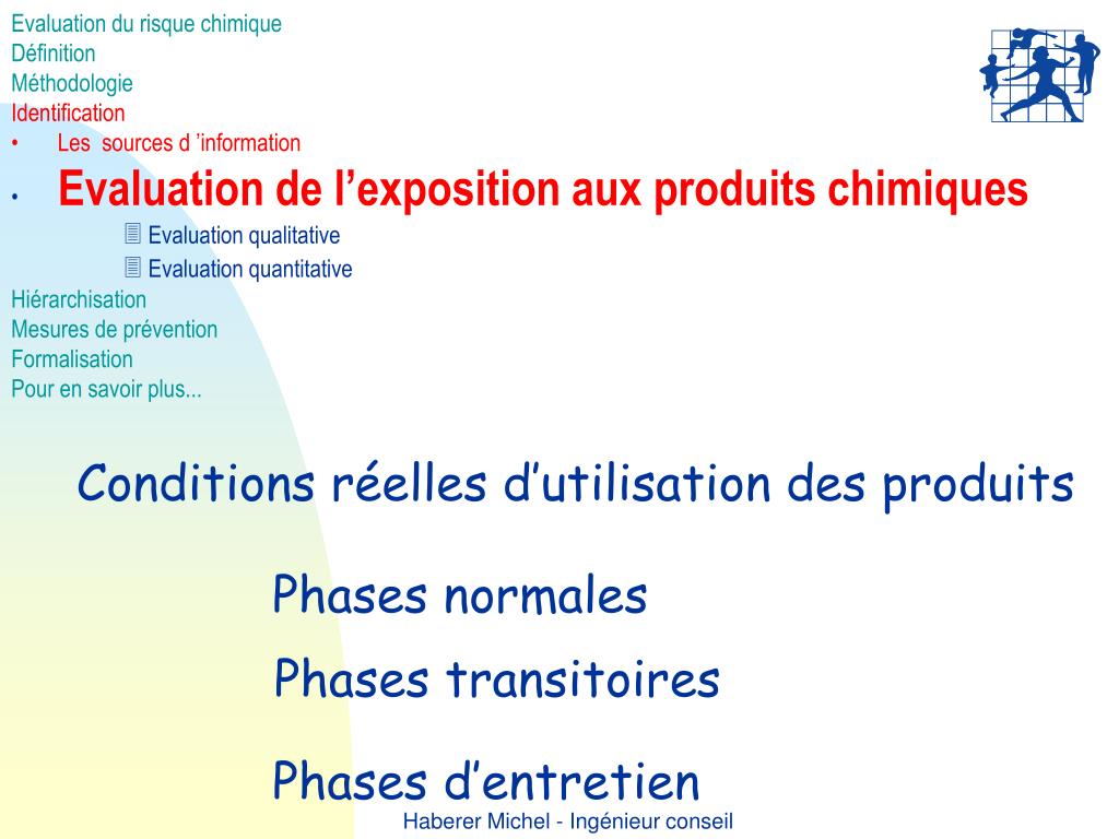 Evaluation du risque chimique • Définition • Méthodologie • Identification • Les sources d ’information • Evaluation de l’exposition aux produits chimiques • Evaluation qualitative • Evaluation quantitative • Hiérarchisation • Mesures de prévention • Formalisation • Pour en savoir plus... Conditions réelles d’utilisation des produits Phases normales Phases transitoires Phases d’entretien