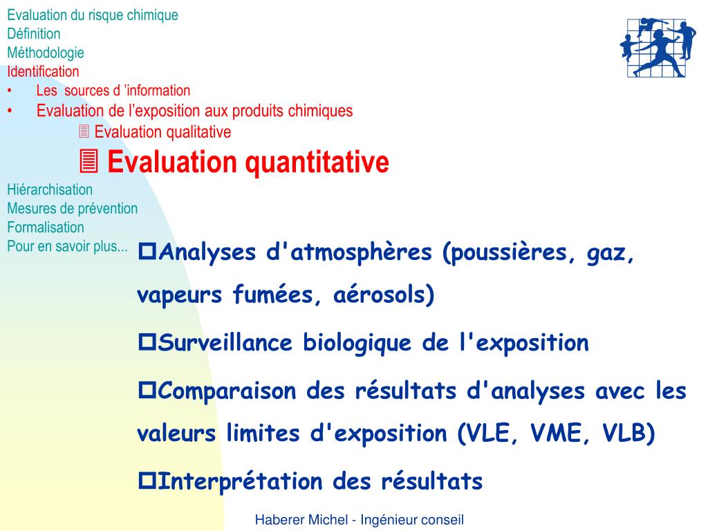 Evaluation du risque chimique • Définition • Méthodologie • Identification • Les sources d ’information • Evaluation de l’exposition aux produits chimiques • Evaluation qualitative • Evaluation quantitative • Hiérarchisation • Mesures de prévention • Formalisation • Pour en savoir plus... • Analyses d'atmosphères (poussières, gaz, vapeurs fumées, aérosols) • Surveillance biologique de l'exposition • Comparaison des résultats d'analyses avec les valeurs limites d'exposition (VLE, VME, VLB) • Interprétation des résultats