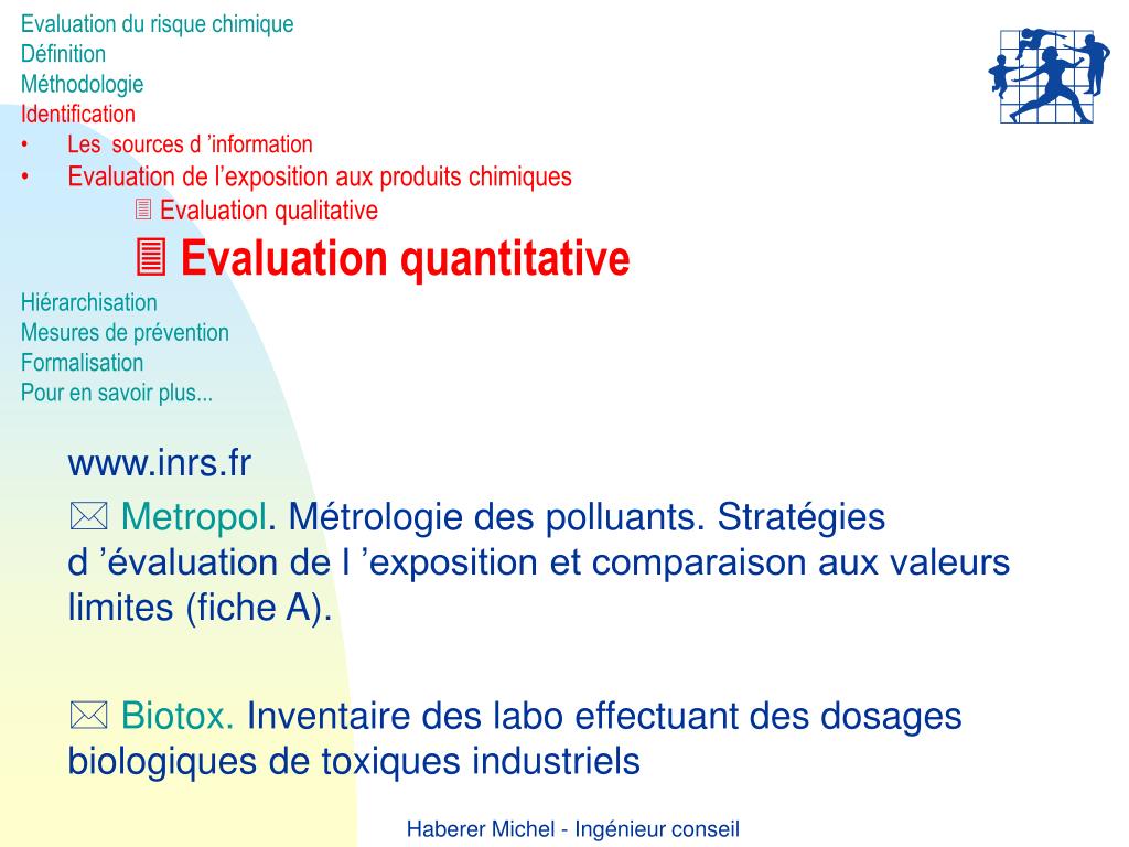 Evaluation du risque chimique • Définition • Méthodologie • Identification • Les sources d ’information • Evaluation de l’exposition aux produits chimiques • Evaluation qualitative • Evaluation quantitative • Hiérarchisation • Mesures de prévention • Formalisation • Pour en savoir plus... • www.inrs.fr • Metropol. Métrologie des polluants. Stratégies d ’évaluation de l ’exposition et comparaison aux valeurs limites (fiche A). • Biotox. Inventaire des labo effectuant des dosages biologiques de toxiques industriels