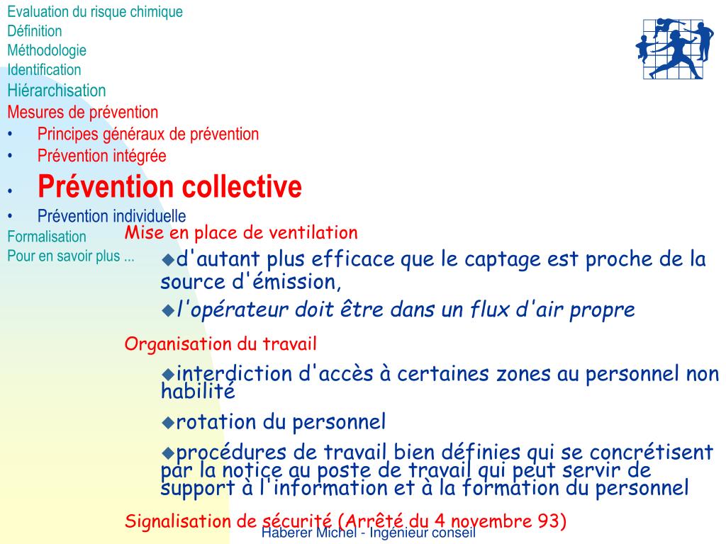 Evaluation du risque chimique • Définition • Méthodologie • Identification • Hiérarchisation • Mesures de prévention • Principes généraux de prévention • Prévention intégrée • Prévention collective • Prévention individuelle • Formalisation • Pour en savoir plus ... • Mise en place de ventilation • d'autant plus efficace que le captage est proche de la source d'émission, • l'opérateur doit être dans un flux d'air propre • Organisation du travail • interdiction d'accès à certaines zones au personnel non habilité • rotation du personnel • procédures de travail bien définies qui se concrétisent par la notice au poste de travail qui peut servir de support à l'information et à la formation du personnel • Signalisation de sécurité (Arrêté du 4 novembre 93)