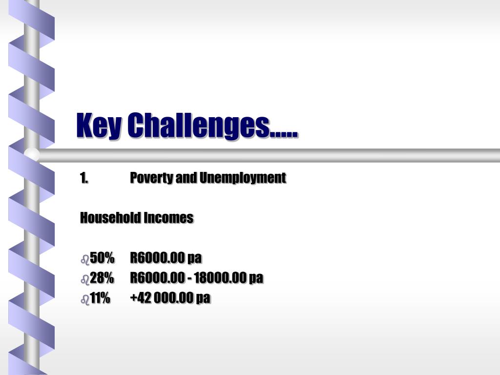 Key Challenges….. 1. Poverty and Unemployment Household Incomes 50% R6000.00 pa 28% R6000.00 - 18000.00 pa 11% +42 000.00 pa