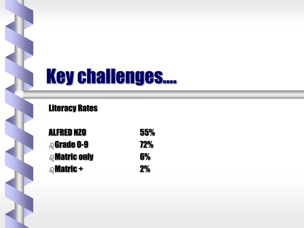 Key challenges.... Literacy Rates ALFRED NZO 55% Grade 0-9 72% Matric only 6% Matric + 2%