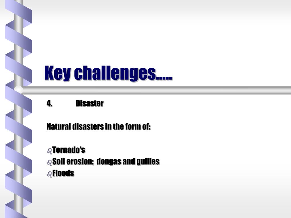 Key challenges….. 4. Disaster Natural disasters in the form of: Tornado's Soil erosion; dongas and gullies Floods