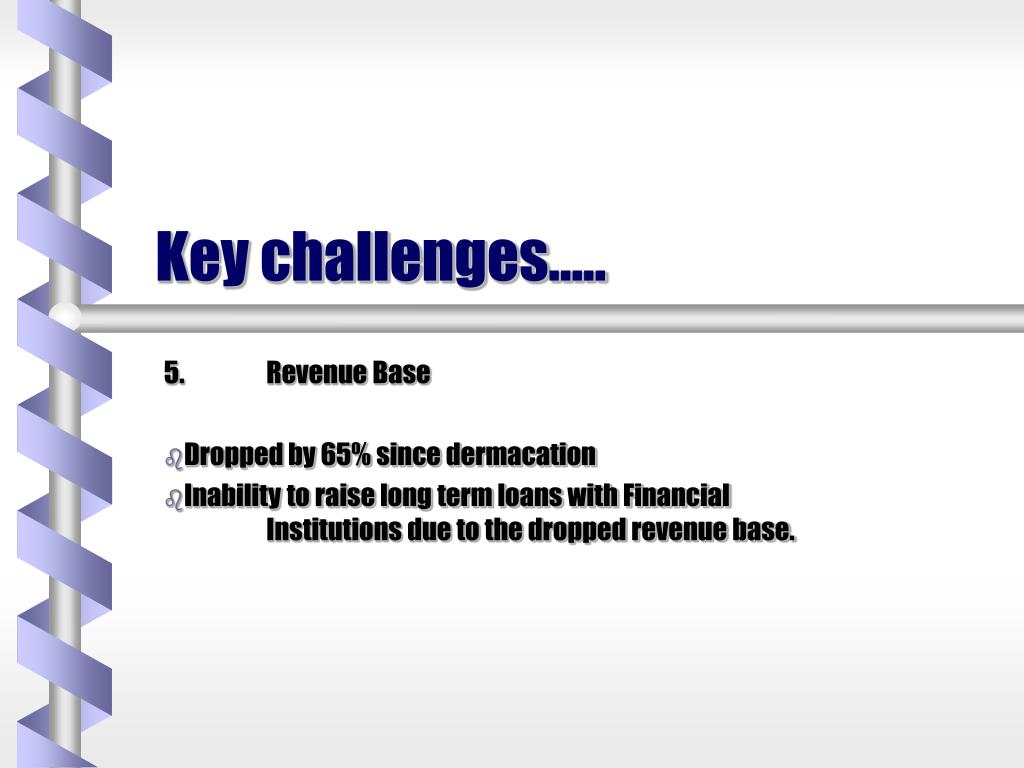 Key challenges….. 5. Revenue Base Dropped by 65% since dermacation Inability to raise long term loans with Financial Institutions due to the dropped revenue base.