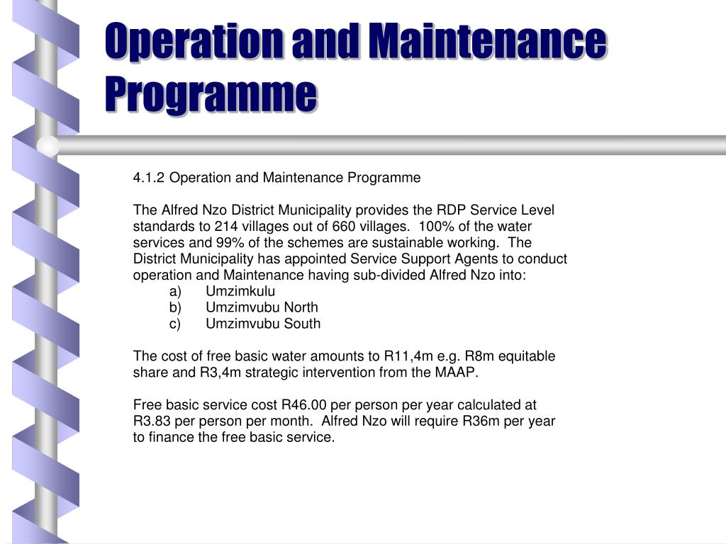 Infrastructure Projects The District Municipality has assumed the water services authority function and the water services and water services authority capacity building has begun from 2002 valued at R4m to be completed in 2004. This training programme encompasses Institutional development, Financial Management and policy and tariff development . The District Municipality has implemented and completed the following water projects in 2002 funded from Masibambane Programme: