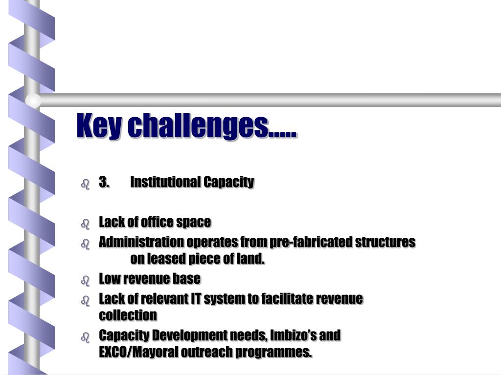 Key challenges….. • 3. Institutional Capacity • Lack of office space • Administration operates from pre-fabricated structures on leased piece of land. • Low revenue base • Lack of relevant IT system to facilitate revenue collection • Capacity Development needs, Imbizo’s and EXCO/Mayoral outreach programmes.
