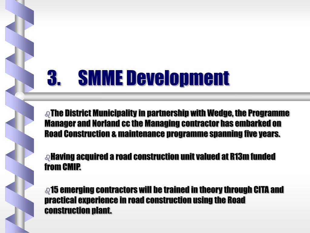 3. SMME Development • The District Municipality in partnership with Wedge, the Programme Manager and Norland cc the Managing contractor has embarked on Road Construction & maintenance programme spanning five years. • Having acquired a road construction unit valued at R13m funded from CMIP. • 15 emerging contractors will be trained in theory through CITA and practical experience in road construction using the Road construction plant.