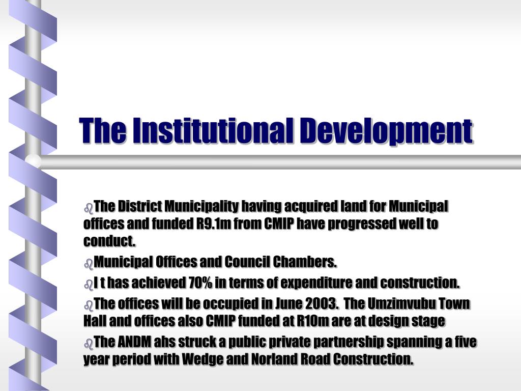 The Institutional Development The District Municipality having acquired land for Municipal offices and funded R9.1m from CMIP have progressed well to conduct. Municipal Offices and Council Chambers. I t has achieved 70% in terms of expenditure and construction. The offices will be occupied in June 2003. The Umzimvubu Town Hall and offices also CMIP funded at R10m are at design stage The ANDM ahs struck a public private partnership spanning a five year period with Wedge and Norland Road Construction.