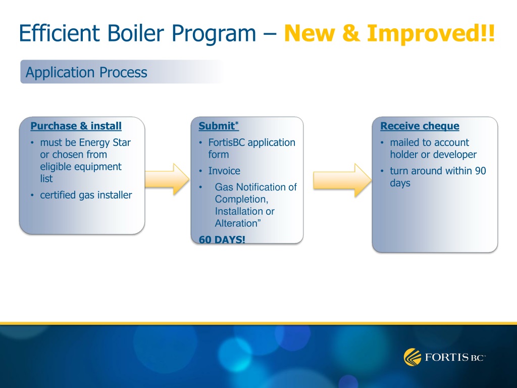 Application Process Efficient Boiler Program – New & Improved!! • Purchase & install • must be Energy Star or chosen from eligible equipment list • certified gas installer • Submit* • FortisBC application form • Invoice • Gas Notification of Completion, Installation or Alteration” • 60 DAYS! • Receive cheque • mailed to account holder or developer • turn around within 90 days