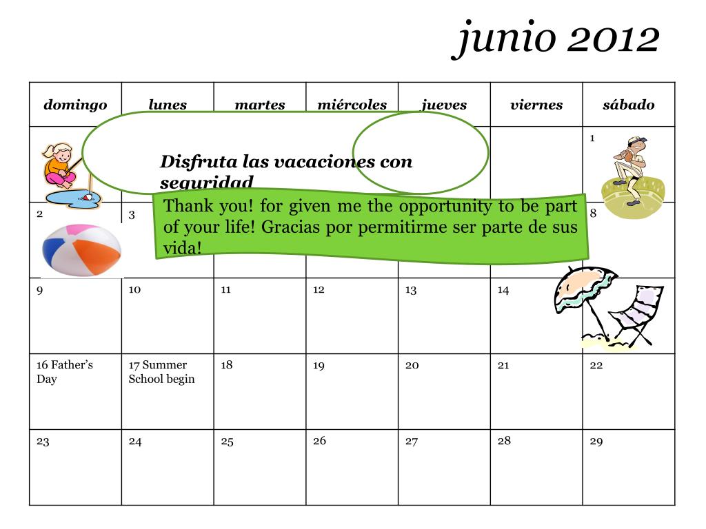 Disfrutalasvacaciones con seguridad junio 2012 Thank you! for given me the opportunity to be part of your life! Gracias porpermitirme ser parte de susvida!