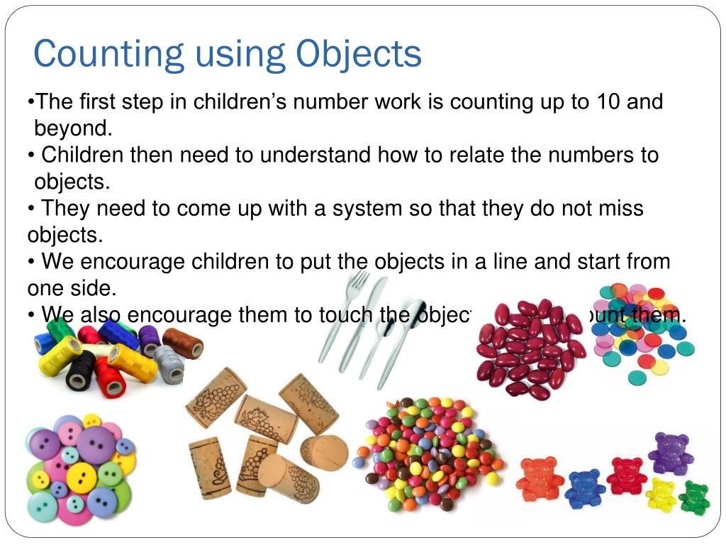 Counting using Objects • The first step in children’s number work is counting up to 10 and beyond. • Children then need to understand how to relate the numbers to objects. • They need to come up with a system so that they do not miss objects. • We encourage children to put the objects in a line and start from one side. • We also encourage them to touch the objects as they count them.